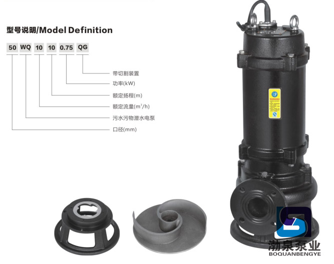 80WQ40-9-2.2QG 無堵塞切割排污泵泵主要用于排送生活廢水、污水、人糞尿及含有短纖維紙屑、木屑、淀粉、泥沙、礦石粒等固體懸浮物和非腐蝕性介質,被抽送液體溫度不超過40℃,密度不大于1200kg/m3,ph值~9。該電泵采用雙端面機械密封和旋轉葉輪,葉輪采用不銹鋼、耐磨損、不堵塞、不纏繞、具有體積小、結構緊湊、攜方便等優點。 適用范圍 80WQ40-9-2.2QG 無堵塞切割排污泵泵主要用于工程污水,生活污水。 如: (1)用于建筑工地、工程基礎施工、市政設施、自來水廠。 (2)各種高樓大廈的地下室、人防坑洞、地鐵等地下層污水排放。 (3)中小型企業污水處理及循環水輸送。 (4)食品、造紙、釀造、鋼鐵及有色金屬、制革、紡織、制藥、水泥廠等廠礦企業的渣漿液抽送。 (5)養雞場,養豬場,各種養殖業,魚池作抽水清塘、增氧,化糞池等各種場合的人畜糞尿抽送等作用。 注:WQ/QG主要性能及數據除不帶切割裝置外,其內部結構均同WQ/QG型。