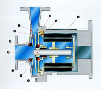 | 1 | 泵 體 | 不銹鋼 | 2 | 葉 輪 | 不銹鋼 | 3 | 隔 板 | 不銹鋼 | 4 | 主 軸 | 不銹鋼 | 5 | 轉子組合 | 稀土永磁體+不銹鋼 | 6 | 隔套總成 | 不銹鋼 | 7 | 動 環 | 填充F4 | 8 | 軸 承 | 填充F4 | 9 | 靜 環 | 碳化硅或氧化鋁陶瓷 | 10 | 密封圈 | 氟橡膠 | | 六、型號意義:
